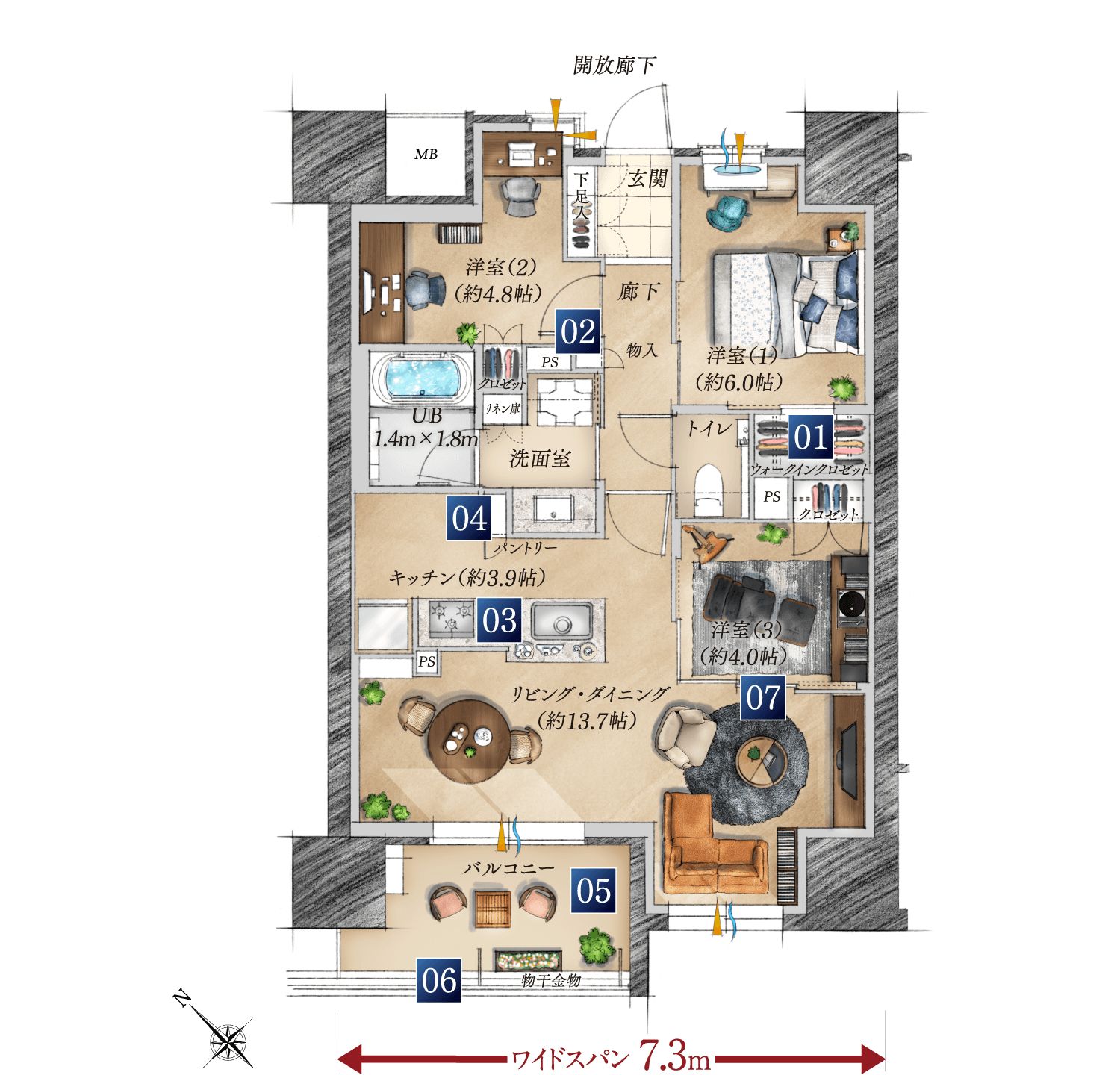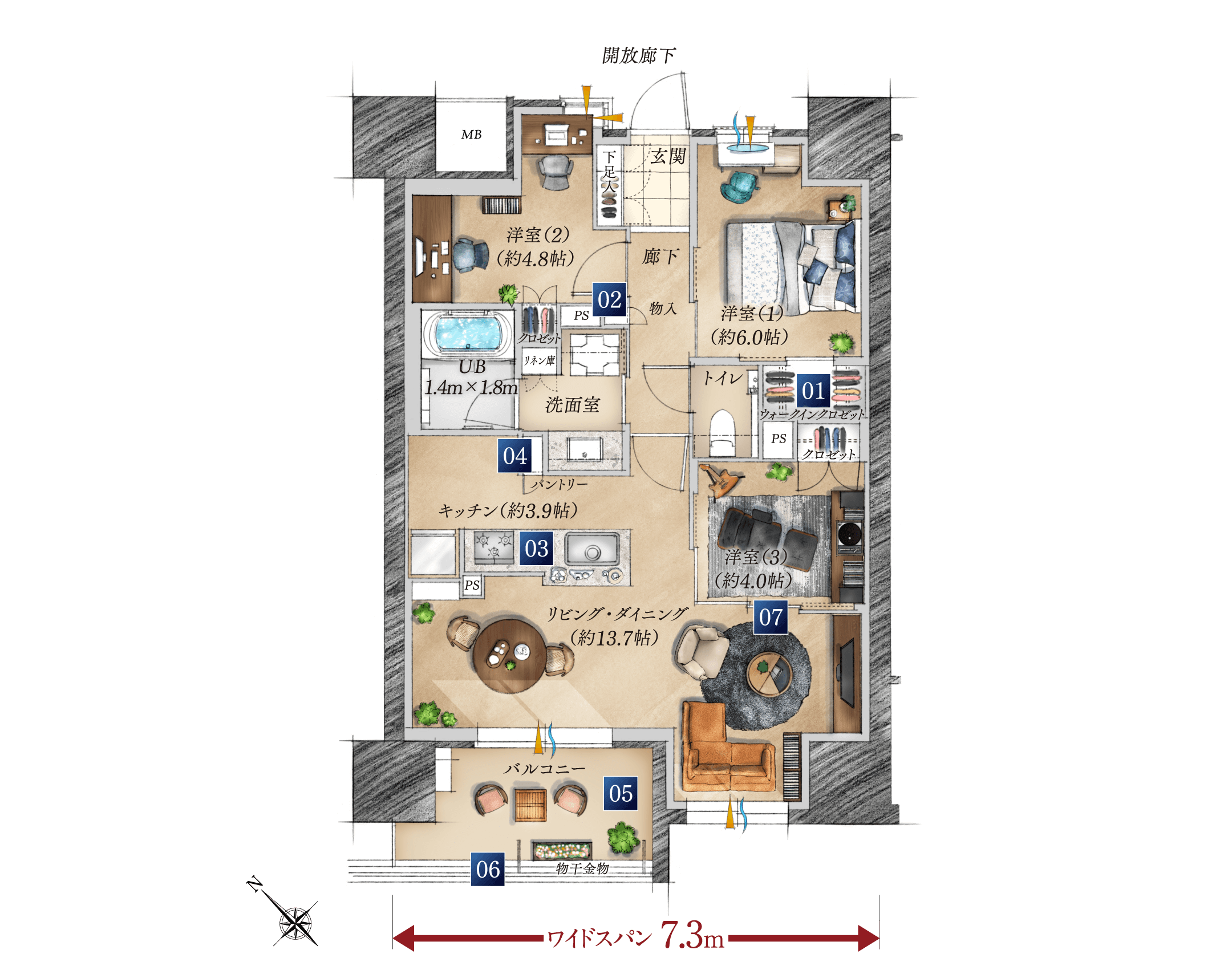 ※ワイドスパン表記は、南東側の壁の中心から北西側の壁の中心までの寸法であり、実際に使用できる寸法とは異なります。