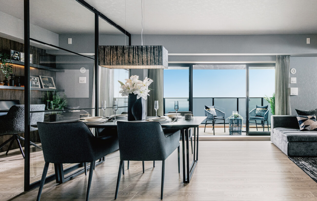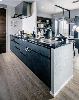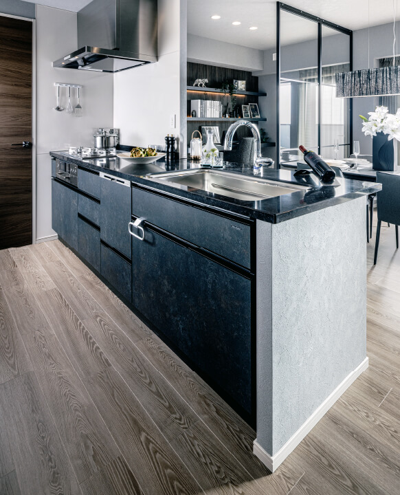 リビング・ダイニングやバルコニーを眺められる対面式キッチン。開放的な気分で調理を楽しめます。