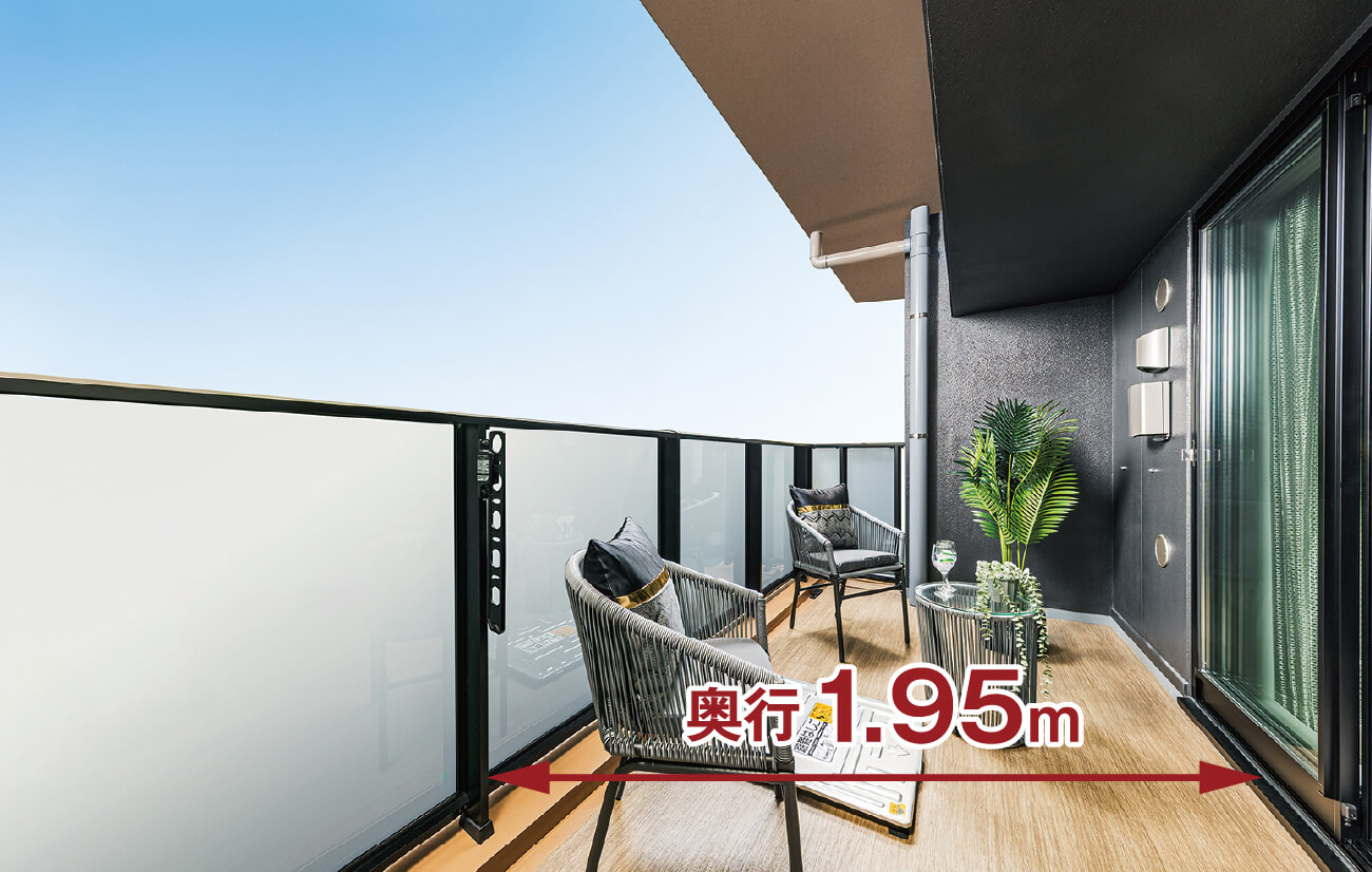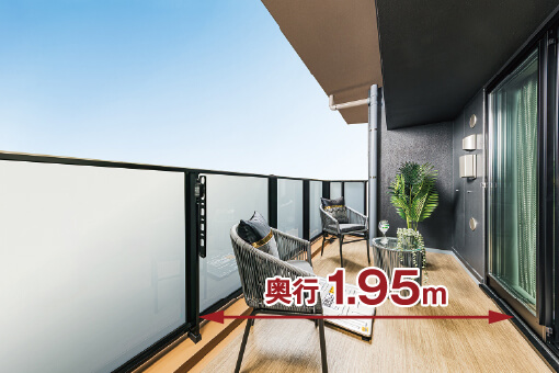 室内から続くような開放感を演出する奥行1.95m以上のバルコニー。ガーデニングなど楽しみが広がります。