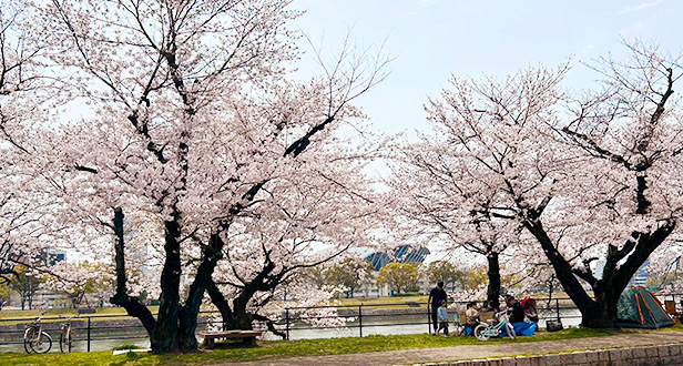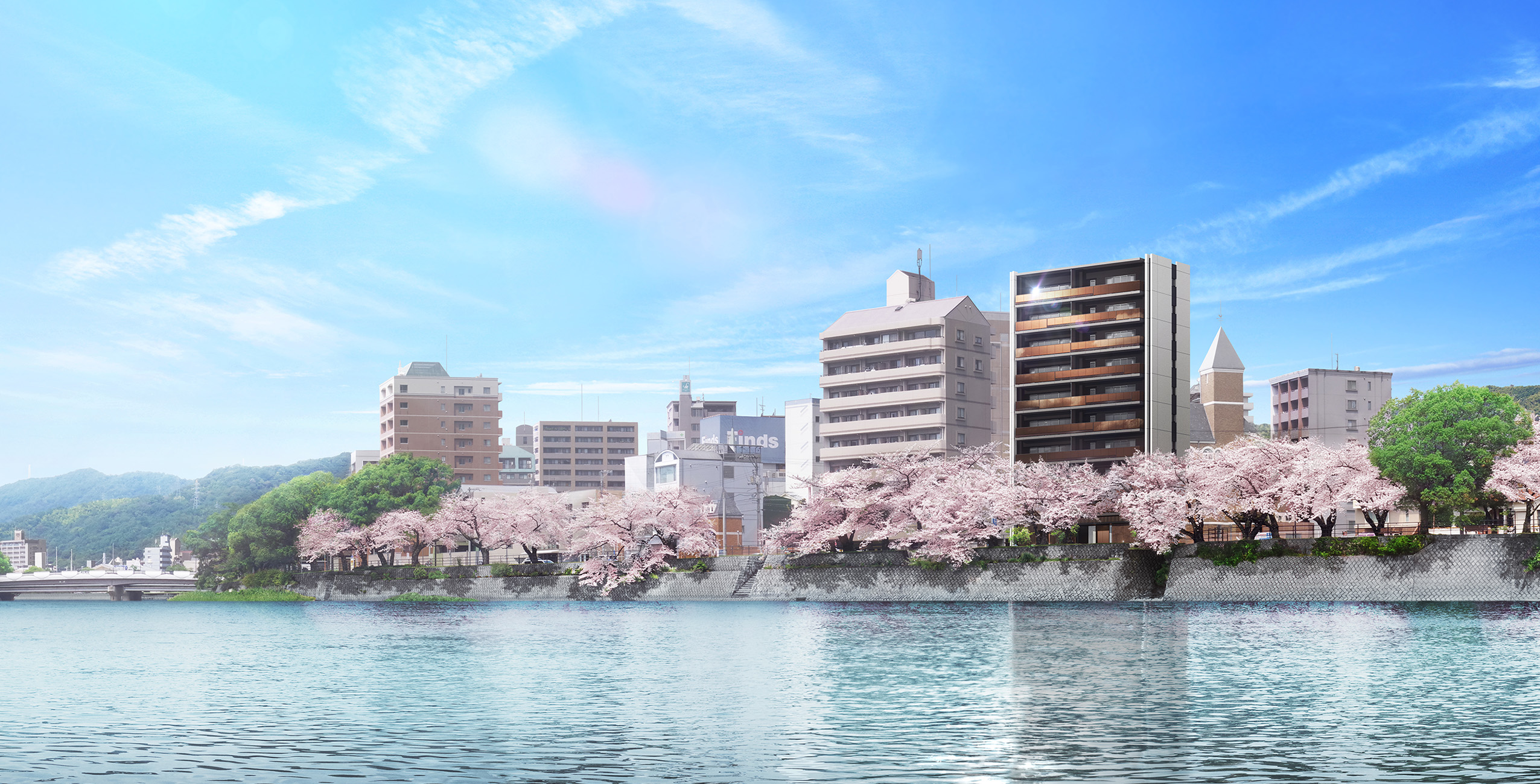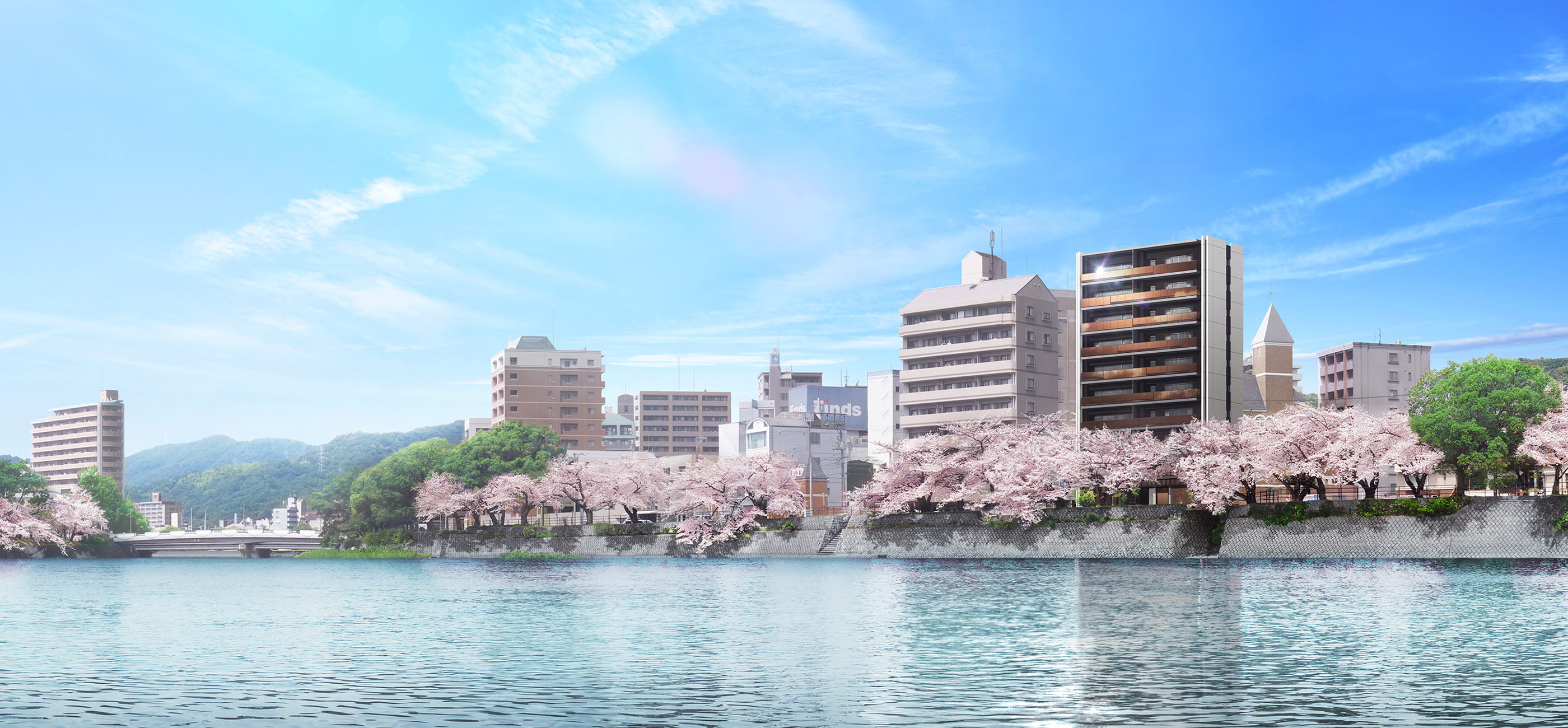 前面の歩道に植えられた桜が、街並みに彩りを添えます。四季折々の自然を身近に感じることができます。