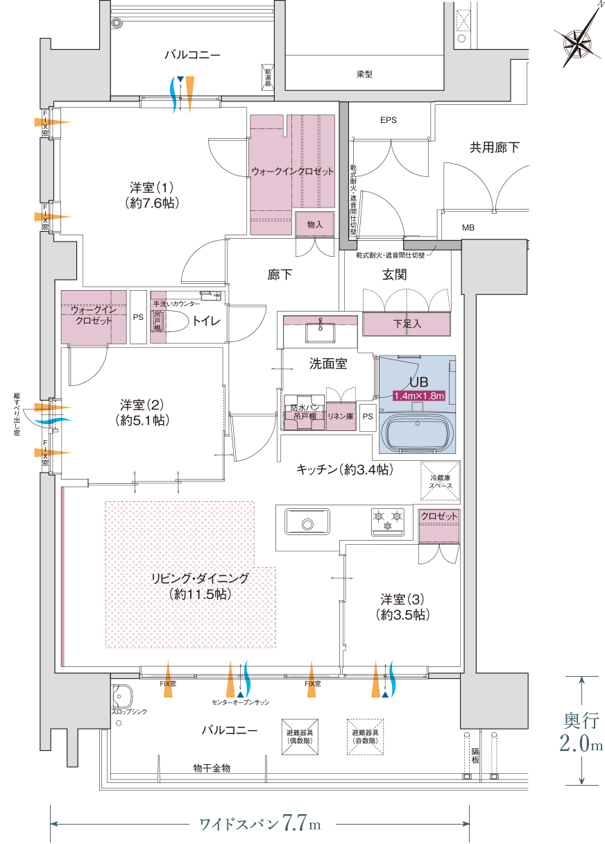 ※バルコニーの奥行は、壁の中心から手すり壁の中心までの寸法であり、実際に使用できる寸法とは異なります。